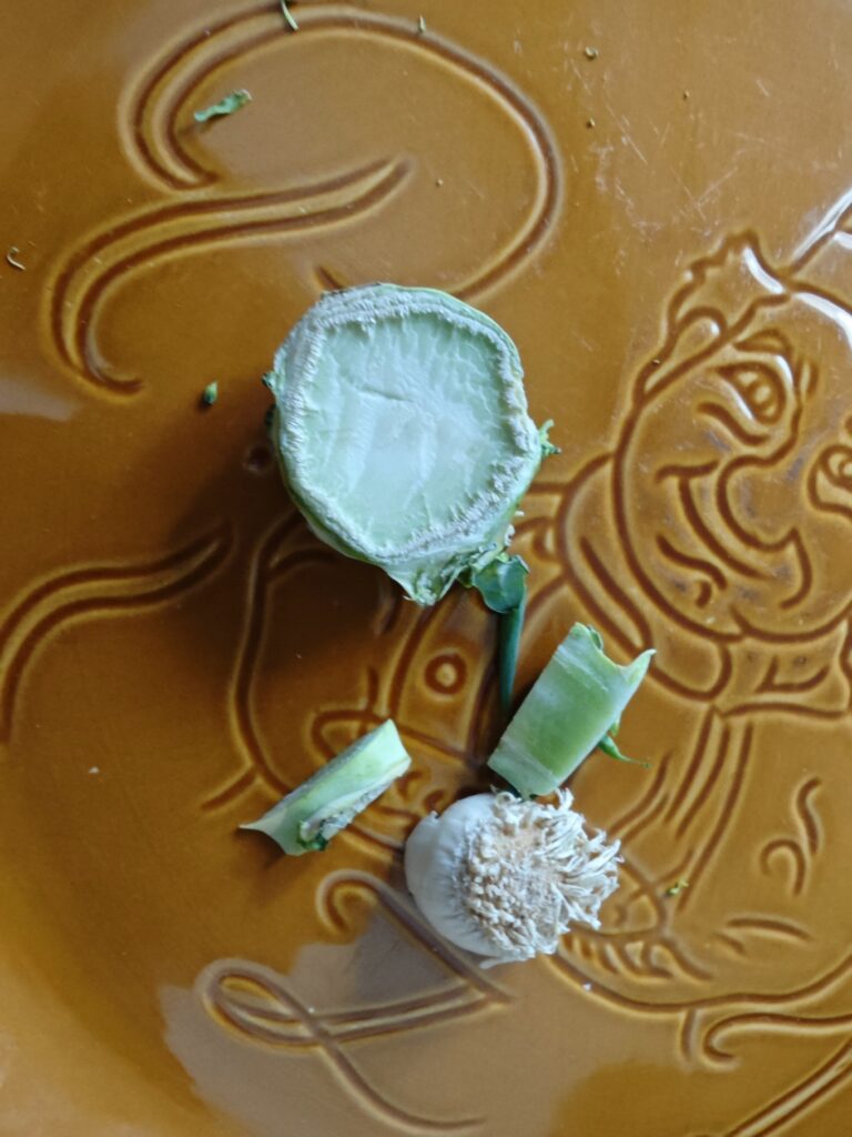 Und so wanderte all dies, auch die REste der Frühlingszwiebel, mit in die Suppe – und nicht in einen Beutel ins Gefrierfach, wo die Gemüsereste auf die Verarbeitung zu einer braunen Soße warten.
